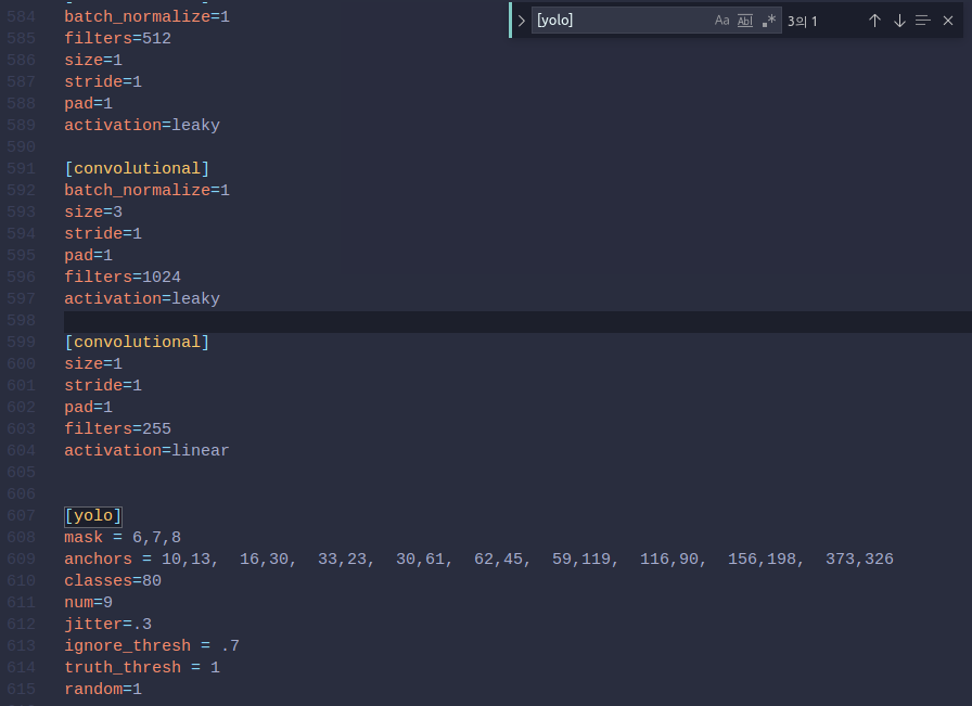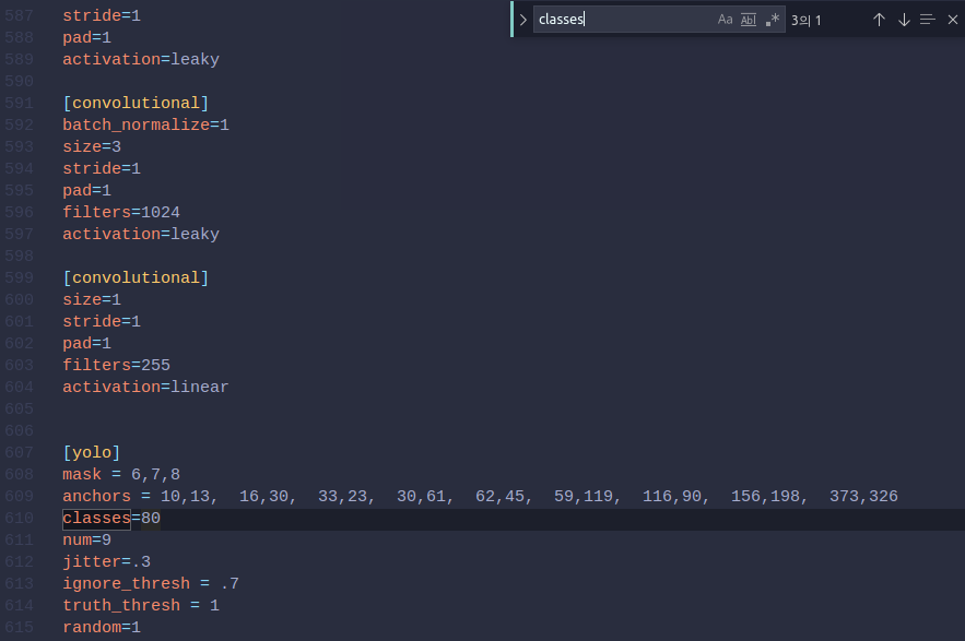 .cfg파일을 열어 변경해야 하는 부분은 classes 입니다. 해당 모델은 ms coco 데이터셋을 사용하는 구조이기 때문에 classes 수가 80입니다. 이 값을 자신이 사용하는 데이터셋의 class 수에 맞게 변경합니다.