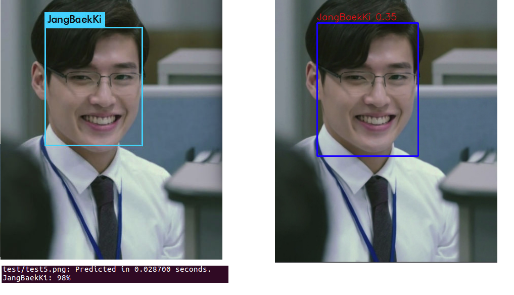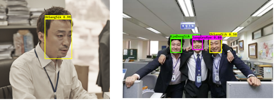 한가지 특이한 점은 darknet모델에서는 오른쪽 이미지의 오상식을 인식하지 못 했는데 변환된 keras 모델에서는 인식하는 결과를 보여주었다. 인물들의 예측 정확도가 darknet의 결과와 비슷하거나 조금 떨어지는 거 같긴 한데 darknet에서 인식하지 못한 인물을 오히려 keras 모델에서 인식한다는 게 좀 특이했다.