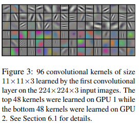 AlexNet은 GPU 2개를 병렬적으로 놓고 트레이닝함, 각 GPU line에서 학습된 커널을 시각화해보니 서로 다른 특성을 학습한 결과를 보임