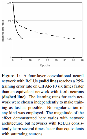 CIFAR-10 dataset으로 training error rate이 25% 도달하는 지점을 비교했을 때 ReLU가 더 빠르다는 것을 보여줌