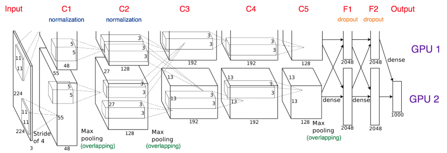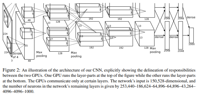 - 당시 사용했던 GPU는 GTX 580으로 메모리가 3GB밖에 되지 않는다. 따라서 하나의 GPU로 네트워크를 학습시키기 어렵기 때문에 2개의 GPU를 병렬적으로 사용한다.