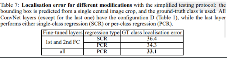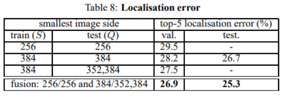 2개의 localization model을 사용하였으며 각각 256x256, 384x384 size로 트레이닝 함. classification model에서 사용된 pre-trained 모델을 사용하기 때문에 별도의 training scale jittering은 사용하지 않음