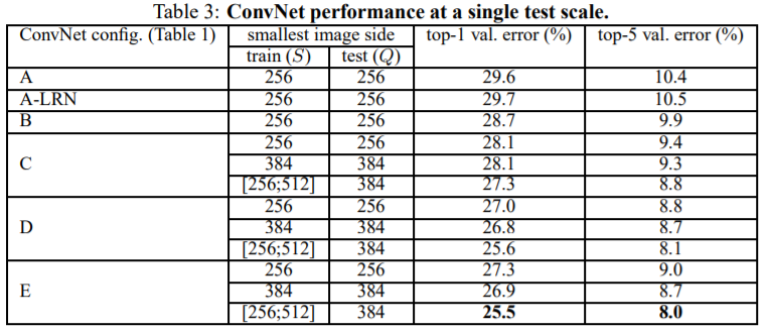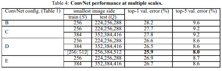 Table 4에서 모델 D의 마지막 결과를 보면 training & testing 과정에서 scale jittering을 적용한 것이 가장 성능이 좋았음. 왜냐하면 네트워크가 testing에서 들어오는 다양한 scale의 이미지를 트레이닝 과정에서 학습할 수 있기 때문