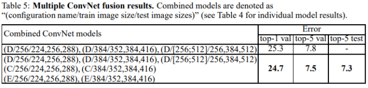 Table 5에서 second row를 보면 scale jittering이 서로 다른 D 모델 3개를 조합함. 그 결과 단일 모델로 D를 사용했을 때 25.9%, 8.0%의 error를 냈던 결과에 비해 25.3%, 7.8%로 더 높은 성능을 냄