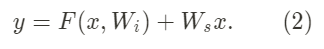 - 한가지 주의해야할 점은 F + x는 element-wise addition 연산이기 때문에 dimension이 일치해야 한다. dimension이 일치하지 않는 경우 linear projection을 사용하여 dimension을 맞춰준다.