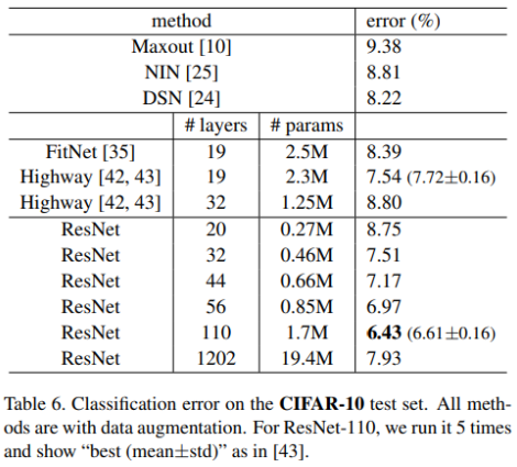 - ResNet-110은 evaluation을 5번 한 거라서 평균, 표준편차까지 기록됨
