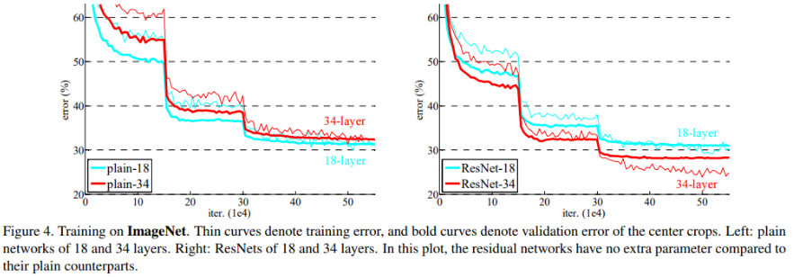 - ImageNet error, 얇은선 = training error, 굵은 선 = validation error