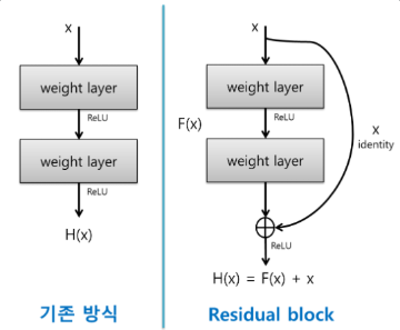 그러나 Residual block에선 H(x)가 F(x) + x가 된다. (여기서 F(x)는 weight layer와 ReLu를 의미한다.)