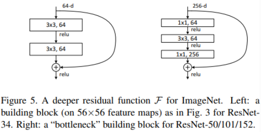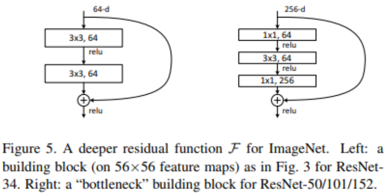 - Deeper Network의 경우 오른쪽과 같은 bottleneck design을 적용한 residual block을 사용한다.