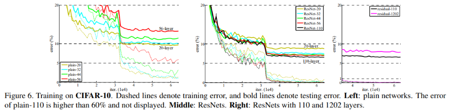 - CIFAR-10은 상대적으로 small dataset이기 때문에 레이어를 1202개까지 사용할 필요가 없다고 봄