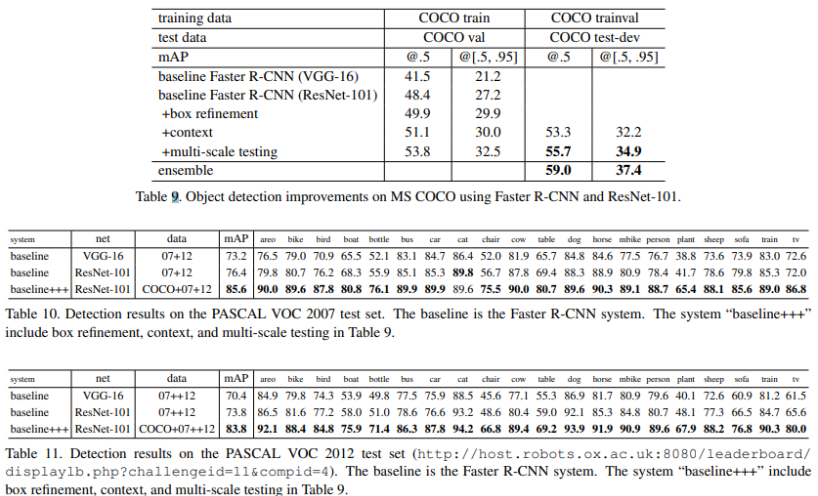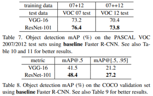 - Table 7에선 Faster R-CNN의 backbone을 VGG16에서 ResNet-101로 바꿨을 때 결과. VGG보다 ResNet을 썼을 때 mAP가 더 높음