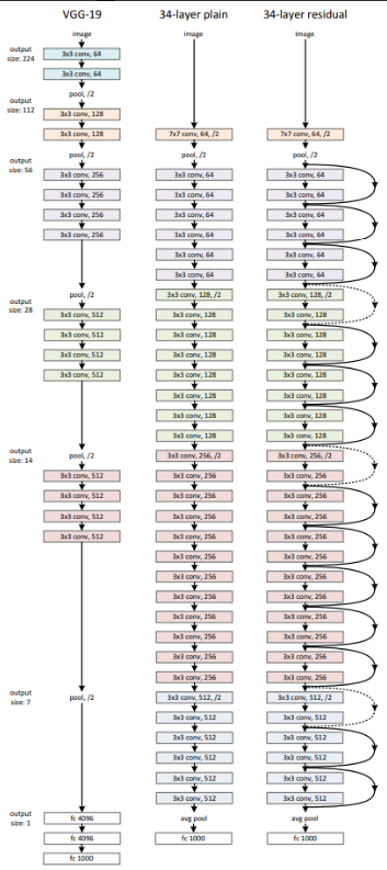 - 네트워크 간 비교에서 VGG19, Plain net, ResNet34를 비교한다.