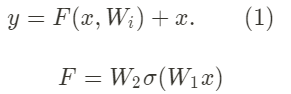 - 여기서 x, y는 input, output이며 function F는 Conv, relu Conv를 의미한다.