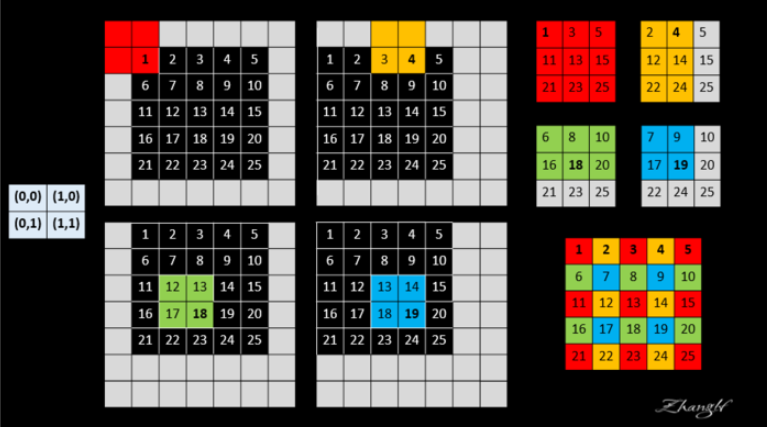 어쨌든 이러한 4개의 output을 combine하여 오른쪽 아래 그림과 같이 입력 사이즈와 동일한 5x5 output을 생성한다.
