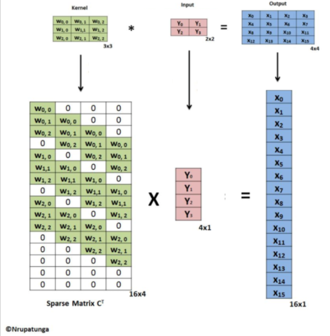 4x4 input은 16x1 vector로 만들어주고 3x3 kernel은 4x16 sparse matrix로 변환하여 계산한다.