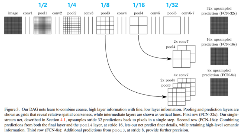 32배 작아진 feature를 가지고 32배 upsampling 하게 되면 디테일한 정보들이 많이 없는 상태에서 과도하게 크기를 늘리게 때문에 정확한 prediction이 어렵다. 그래서 논문에선 사이즈를 차근차근 증가시키고 coarse feature에서 부족했던 정보를 pool3, pool4에서 가져와서 결합한 뒤 채우겠다는 것이다. coarse feature는 상대적으로 global feature를 담고 있기 때문에 local feature가 부족하고 부족한 local feature를 이전 레이어의 feature에서 가져오겠다는 것