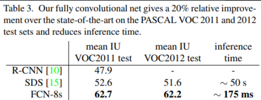 - 제안하는 FCN은 PASCAL VOC segmentation task에서 SOTA를 달성하였다. (기존 모델대비 약 20%의 성능 향상)