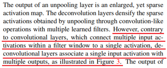 unpooling layer가 size를 복원하긴 하지만 max 값이 아닌 값들은 0으로 채우기 때문에 결국에는 sparse activation map이 된다. 논문에서는 이 sparse activation map을 deconvolution layer를 통해 dense하게 만들어준다.