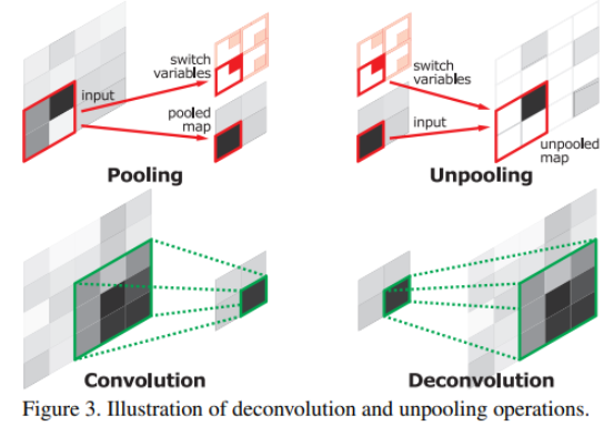 따라서 deconvolution network에서는 pooling의 역연산인 unpooling 연산을 통해 feature의 original size를 복원한다. pooling layer를 거친 값이 기존 matrix에서 어느 위치에 존재했는지 그 값을 기억하고 있으면 동일한 위치의 값으로 복원할 수 있기 때문에 위치정보가 손실되는 문제를 해결할 수 있다.