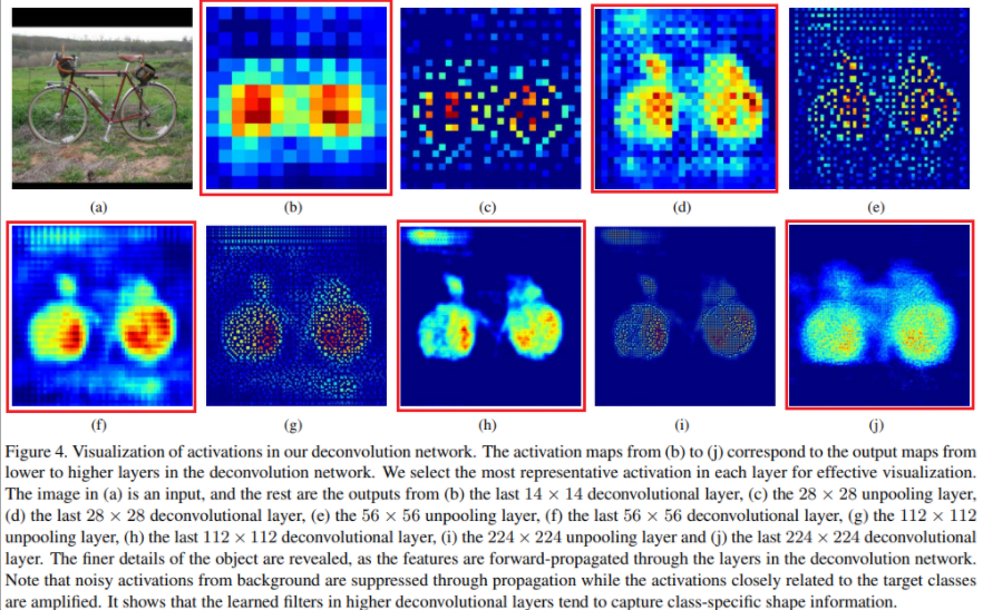 아래 그림 4는 deconvolution network에서 각 layer output을 시각화한 결과다. 빨간색으로 box친 b, d, f, h, j는 deconvolution layer output이고 c, e, g, i는 unpooling layer output이다. 각 레이어를 거듭하면서 추출되는 feature가 coarse → fine으로 바뀌는 것을 볼 수 있다. 즉, lower layer에서는 객체의 전반적인 형상(location, shape, region)을 추출하게 되고 higher layer에서는 좀 더 복잡한 패턴이 추출된다.