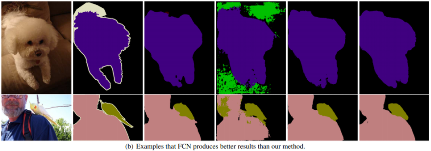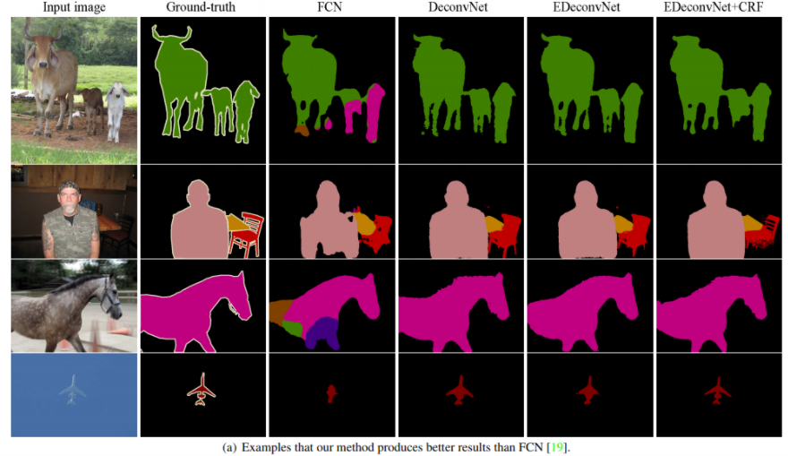 각 모델의 정성적 결과는 아래 그림과 같다. (a)에선 대체로 Deconvnet의 경우 FCN보다 fine segmentation 결과를 보여주고 multi-scale object 또한 잘 분할하는 모습을 보여준다. FCN의 경우 고정된 receptive field를 사용하기 때문에 객체 크기가 너무 크거나 작은 경우 정확도가 상당히 떨어지는 결과를 보여준다.