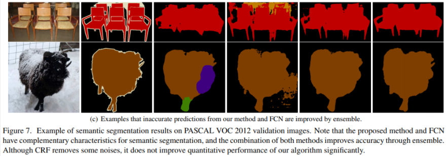 FCN, DeconvNet의 개별 모델에서 잘못된 labeling map이 그려졌음에도 불구하고 두 모델을 앙상블 했을 때 오히려 개선된 결과를 보여준다. 나아가 여기에 CRF를 적용하게 되면 더 정확한 segmentation map이 만들어진다.