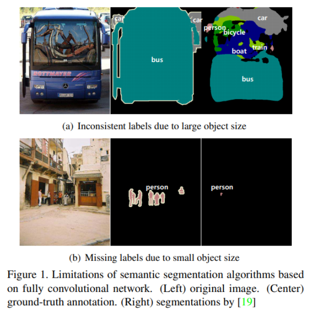 고정된 receptive field를 사용하는 FCN은 아래와 같이 객체 크기에 따라 잘못된 output을 만들어낼 수 있다. (a)의 경우, bus가 receptive field보다 크기가 훨씬 크기 때문에 bus가 가지고 있는 전체적인 특징을 보지 못하고 제한된 local 정보만 추출하게 된다. (b)의 경우 객체의 크기가 너무 작아서 background로 인식해버리는 문제가 발생한다.