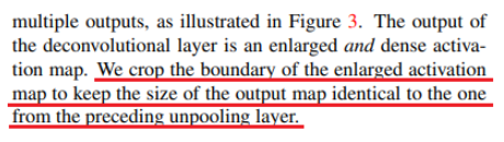 unpooling과 마찬가지로 deconvolution layer 또한 feature size를 upsampling한다. 논문에서는 unpooling layer output과 동일한 size로 맞춰주기 위해 deconvolution layer output을 동일한 사이즈로 crop했다고 한다.