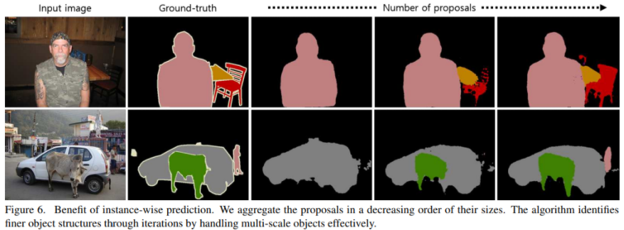 아래 그림 6은 instance-wise prediction을 적용했을 때 결과를 보여준다. 입력 이미지에 다양한 스케일의 객체가 존재할 때 proposal 수를 늘릴수록 작은 크기의 객체 또한 잘 잡아내는 것을 볼 수 있다.