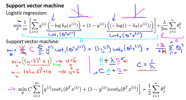 여기서 람다는 A와 B를 trade off하기 위한 파라미터였다. SVM에서는 람다가 trade off를 하기 위한 파라미터가 아니라 다른 파라미터를 사용한다. 이 파라미터를 C라고 하면 CA + B가 되고 우리가 하고자 하는 것은 CA+B를 최소화하는 파라미터 θ를 찾는 것이다. C가 매우 작은 값이라면 B가 A보다 더 큰 값을 가지게 된다.